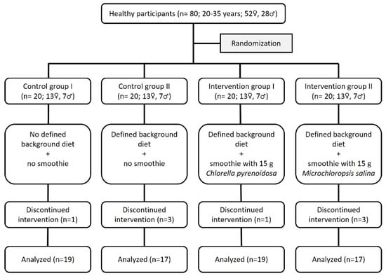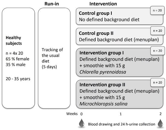 A randomized controlled study with a parallel design was conducted (Figure 1). The 80 subjects were randomly divided into 4 groups (allocation ratio: 1:1:1:1). The randomization was performed with RandomizerR by R-Studio statistics (RStudio PBC, Boston, MA, USA). Patients in the 2 intervention groups and control group II (CG2) received menu plans to standardize their background diet over the study period. The plans were adapted for energy and nutrient requirements, which in turn were dependent on age, sex and physical activity of the participants. Subjects in both intervention groups consumed a smoothie daily, either with 15 g of Chlorella pyrenoidosa d.w. or 15 g of Microchloropsis salina d.w. Two control groups that were not given microalgae were included in the study. Control group I (CG1) received no standardized menu plans, whereas CG2 cooked from defined menu plans. In the run-in phase of 5 days, participants had to keep a nutrition diary, and their physical activity was tracked. Collections of blood and 24-h urine samples were obtained at the beginning and the end of the 14-day treatment period. Furthermore, anthropometric data, blood pressure and body composition were determined.