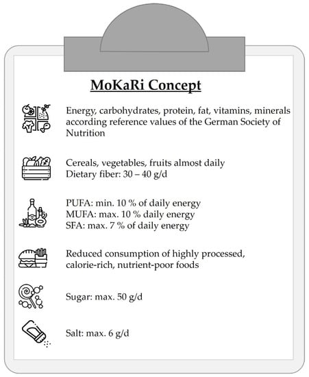 The participants of CG2 and the intervention groups were given individual menu plans that were developed according to the MoKaRi concept (Figure 2). However, menu plans containing fish and seafood were excluded from the diet, and the total fiber consumption was slightly reduced compared to the MoKaRi concept [].