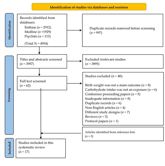 The study protocol was registered with the International Prospective Register of Systematic Reviews on 8 March 2022 (CRD42022298544). The literature search was conducted on Embase, Medline, and PsycInfo without restriction to a specific period to locate all eligible articles using words related to pregnancy, carbohydrates, newborns, and birth weight (Appendix A). The search was restricted to articles published in English. In addition, the reference lists of located articles were scanned to attain relevant additional articles.