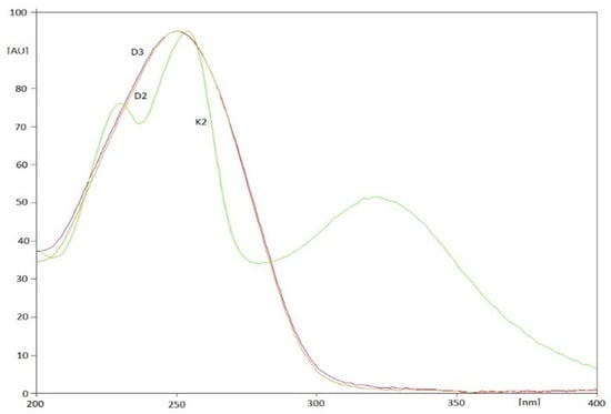 By optimizing the conditions for the separation and determination of vitamins, it was found that the most optimal separation occurs with the use of TLC Silicagel 60F254 plates activated by direct immersion in a 10% (v/v) solution of paraffin in cyclohexane for 5 min, followed by drying in an incubator at 60 °C for 10 min. Plates prepared in this way were developed in a chromatographic chamber saturated with the mobile phase (for 15 min) along a distance of 12 cm, using a mixture of methanol-water (19:1, v/v). The total development time was approx. 2.5 h. The air-dried plates were scanned densitometrically at an analytical wavelength of 254 nm. The choice of wavelength was made on the basis of absorption spectra for standard solutions of vitamins D2, D3 and K2 recorded directly from chromatograms (Figure 2). On the basis of the obtained RF values and absorption spectra in the range of 200–400 nm, registered for reference substances and ingredients of supplements, individual vitamins were identified. However, for quantitative determinations, peak area values recorded on densitograms were used.