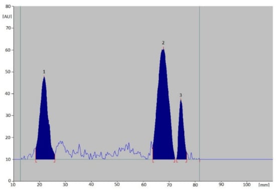 An example densitogram obtained for the standard solutions of the analyzed vitamins (1—K2, 2—D3, 3—D2).