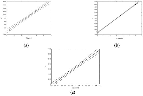 Calibration curves (peak area vs concentration; ±0.95% conf. int.) for vitamin standard solutions: D2 (a), D3 (b) and K2 (c).