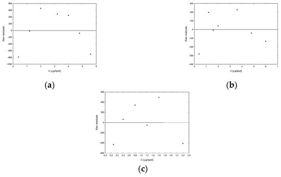 Next, the developed procedure was validated in order to confirm its reliability. In order to determine linearity, standard solutions of vitamins were prepared with concentrations: for vitamin D2 0.40–5.60 μg/spot, for D3 0.40–6.00 μg/spot and for K2 0.08–2.40 μg/spot. Then, they were applied to chromatographic plates and subjected to further analysis according to the procedure described above. The obtained values of peak areas corresponding to individual vitamins were the basis for plotting calibration curves (Figure 4). The plots of residuals show how much the obtained residuals deviate from the regression line and the location of the points looks random (Figure 5). After statistical analysis of the obtained results, the values of individual regression parameters were determined, which are summarized in Table 1.