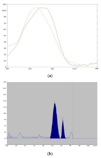 Absorption spectra in the UV range ((a); light green line—D3, dark green line—X) and an example densitogram ((b); 1—D3, 2—X) recorded for Product B.