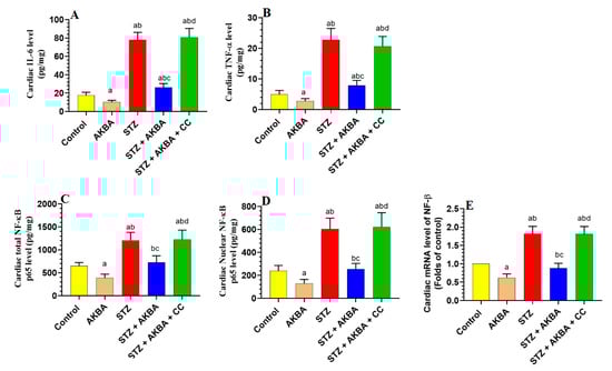 3.6. AKBA Suppressed NF-κB p65 and Cytokines Levels in the LVs of the Control and STZ-Diabetic Rats in an AMPK-Dependent Manner