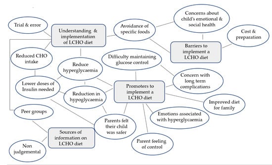 Four integrated concepts were developed from the participants’ descriptions of their experiences: (1) understanding and implementation of low CHO diets; (2) promoters to implementing a low CHO diet; (3) barriers to implementing a low CHO diet; and (4) sources of information on low CHO diets. A thematic map of the key themes can be seen in Figure 1.