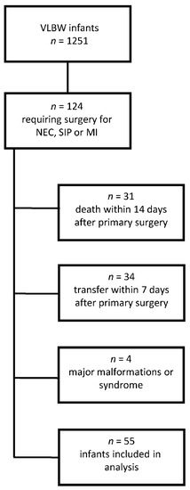 Between January 2006 and December 2018, a total of 1251 VLBW preterm infants were treated on the NICU of Hannover Medical School. Of those, 63 patients (5.0%) developed NEC, with 45 infants requiring surgery. SIP was diagnosed in 53 infants (4.2%), and MI in 26 patients (2.1%), all of whom underwent surgery. All operated infants received an enterostomy. Sixty-nine of these surgically treated infants (55.6%) were excluded from further analyses due to an early transfer to another hospital, death or major malformations (one congenital disorder of glycosylation (CDG) syndrome; one Cornelia-de-Lange-syndrome; two complex cardiac defects). Figure 1 provides further details on patient recruitment.