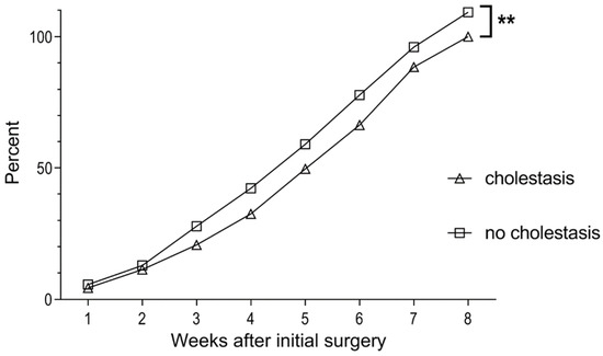 Median weight gain per week after initial surgery in percent of weight at surgery for infants with and without cholestasis. Paired t-test, ** p = 0.0011.