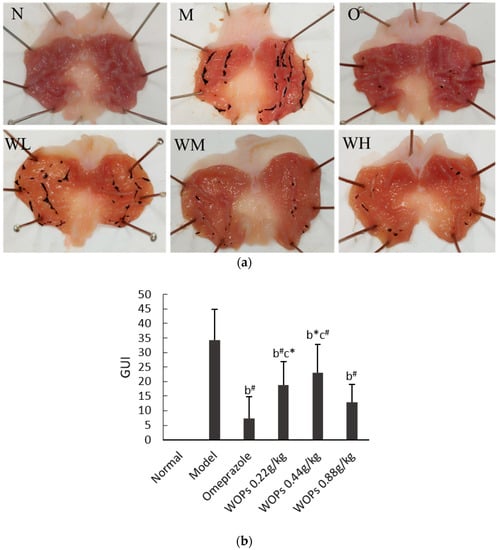 As shown in Figure 1a, no macroscopic lesion was observed in the normal group (group N), whereas the rats in the model group treated with indomethacin at a dose of 48 mg/kg exhibited serious gastric mucosal injury in the form of linear or striped bleeding bands. However, in the omeprazole group, the observed gastric mucosal damage was the lightest among all the groups, and most of the rats had no inflammatory reaction or injury (group O). The three WOPs pretreatment groups (WL, WM, and WH groups, respectively) showed medium to slight gastric mucosal damage compared to the model group, and the WOPs-HG (0.88 g/kg body weight) group exhibited the lightest gastric mucosa injury.