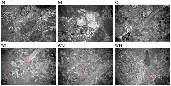 Transmission electron micrograph images of gastric injuries (three per group). The red arrows represent major changes in the organelles. N, normal group; M, model control group; O, omeprazole group (0.02 g/kg); WL, WOPs 0.22 g/kg; WM, WOPs 0.44 g/kg; WH, WOPs 0.88 g/kg. WOPs, walnut oligopeptides.