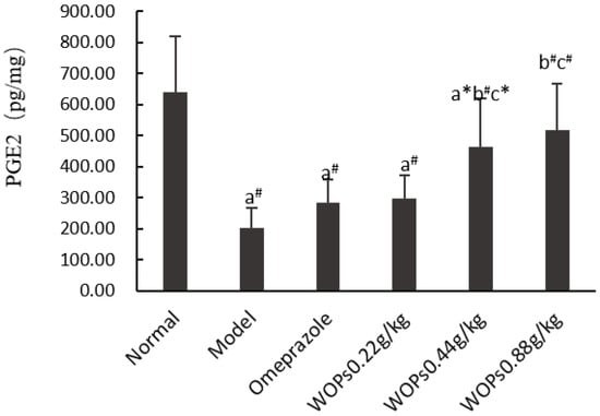 Effects of WOPs on PGE2 synthesis in gastric tissue of indomethacin-induced rats. Significance was represented as * p < 0.05, # p < 0.01; a represents comparison with the normal group, b refers to comparison with the model group, and c refers to comparison with the omeprazole group; 10 per group. PGE2—prostaglandin E2; WOPs—walnut oligopeptides.