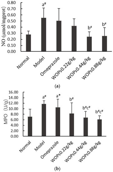 The contents of nitric oxide (NO) (Figure 4a) and myeloperoxidase (MPO) (Figure 4b) were remarkably elevated in the model group compared to the normal group (p < 0.01). In contrast, in the WOPs-treated group, the levels of NO and MPO were markedly declined compared with the model group (p < 0.01), except for the NO level in the WOPs 0.22 g/kg group. The MPO level in the WOPs pretreatment groups (0.44 and 0.88 g/kg) was markedly decreased in comparison with that of the omeprazole group (p < 0.01), but the NO levels were not significantly different (p > 0.05). These findings indicated that the WOPs pretreatment could prevent indomethacin-induced gastric ulcers to a certain extent.