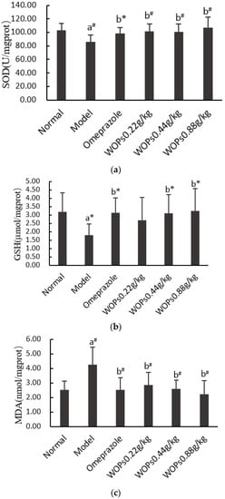 As presented in Figure 5, indomethacin triggered a decrease in superoxide dismutase (SOD) and reduced the glutathione (GSH) levels and there was an increase in the malondialdehyde (MDA) levels in the model group compared with the normal group (p < 0.01, p < 0.05, and p < 0.01, respectively). Compared with the model group, the levels of SOD and GSH were markedly elevated, and the MDA level significantly decreased when the rats were orally administrated omeprazole and WOPs (0.22, 0.44, and 0.88 g/kg) (p < 0.05 or p < 0.01), except for the GSH content in the WOPs 0.22g/kg group. However, there was no obvious difference between the omeprazole and WOPs groups (p > 0.05).