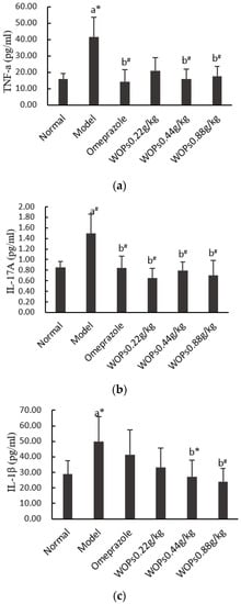 Effects of WOPs on serum TNF-α (a), IL-17A (b), IL-1β (c) levels in indomethacin-treated rats. Significance was represented as * p < 0.05, # p < 0.01; a—compared with normal group, b—compared with model group; 10 per group. Tumor necrosis factor α—TNF-α; interleukin (IL)-17A—IL-17A; interleukin (IL)-1β—IL-1β; WOPs—walnut oligopeptides.