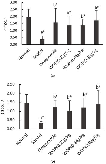 Both COX-1 and COX-2 are the core enzymes of the arachidonic acid metabolism, which are considered to be the primary regulators of NSAIDs-induced gastric ulcers. The expression levels of COX-1 (Figure 7a) and COX-2 (Figure 7b) were markedly suppressed in the model group compared to the normal group (p < 0.01 and p < 0.05, respectively). In contrast, the mRNA expression of COX-1 and COX-2 was significantly higher in the omeprazole and three WOPs pretreatment (0.22, 0.44, and 0.88 g/kg) groups than in the model group (p < 0.05 or p < 0.01).