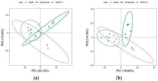 Score chart of PCA analysis model. (a) Positive ion mode; (b) negative ion mode. PC1 represents the first principal component, PC2 refers to the second principal component, and the number in parentheses is the score of the principal component, which represents the percentage of the overall variance explained for the specific principal component. The ellipses are 95% confidence intervals. Each point represents one sample, with six samples per group, and different groups are labeled with different colors.