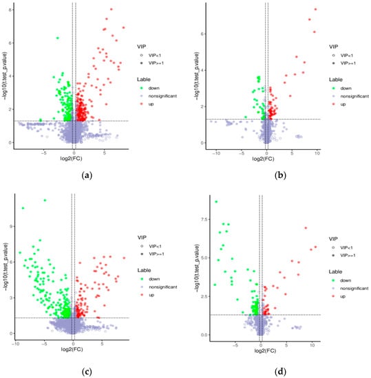 Volcano map of differential metabolites. (a) Positive ion mode (WOPs-HG group vs. model group); (b) negative ion mode (WOPs-HG group vs. model group); (c) positive ion mode (WOPs-HG group vs. omeprazole group); (d) negative ion mode (WOPs-HG group vs. omeprazole group). Green is the downregulated differential metabolite (labeled green), red is the upregulated differential metabolite (labeled red), and metabolites without difference are labeled with purple-gray.
