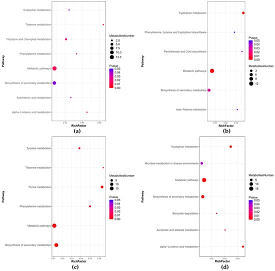 Bubble plots for metabolic pathway enrichment analysis. (a) Positive ion mode (WOPs-HG group vs. model group); (b) negative ion mode (WOPs-HG group vs. model group); (c) positive ion mode (WOPs-HG group vs. omeprazole group); (d) negative ion mode (WOPs-HG group vs. omeprazole group). X-axis enrichment factor (RichFactor) is the number of differential metabolites annotated to the pathway divided by all identified metabolites annotated on the pathway. The larger the value, the greater the proportion of differential metabolites. The dot size represents the number of differential metabolites annotated to this pathway.