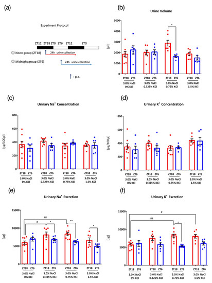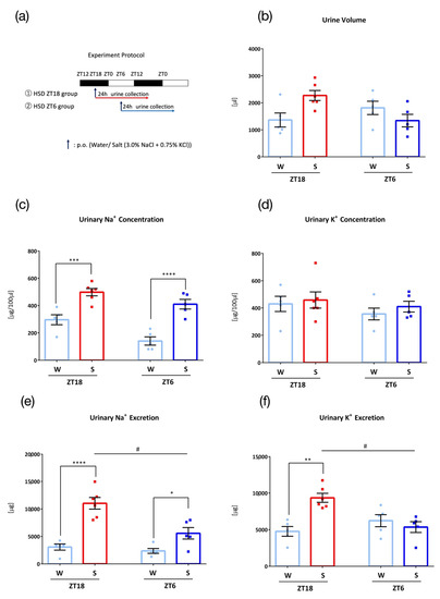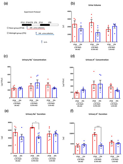 - Oike, H.; Nagai, K.; Fukushima, T.; Ishida, N.; Kobori, M. High-salt diet advances molecular circadian rhythms in mouse peripheral tissues. Biochem. Biophys. Res. Commun. 2010, 402, 7–13. [Google Scholar] [CrossRef] [PubMed]