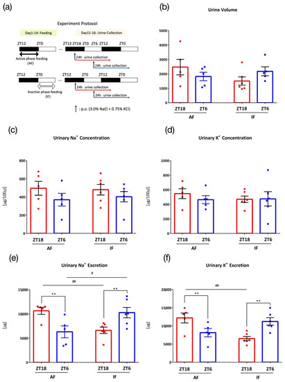 - Rhoads, M.K.; Speed, J.S.; Roth, K.J.; Zhang, D.; Jin, C.; Gamble, K.L.; Pollock, D.M. Short-term daytime restricted feeding in rats with high salt impairs diurnal variation of Na(+) excretion. Am. J. Physiol. Ren. Physiol. 2022, 322, F335–F343. [Google Scholar] [CrossRef]