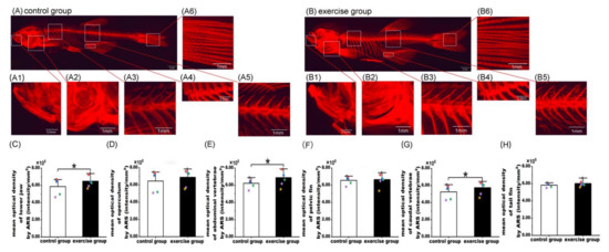 Alizarin red S (ARS) staining of bone tissue and quantification of bone mineralization in the control and exercise groups. Fluorescent image of ARS staining of zebrafish to visualize the whole-body skeleton of the control (A) and exercise (B) groups. Magnified fluorescent images of the lower jaw (A1,B1), operculum (A2,B2), abdominal vertebrae (A3,B3), pelvic fin (A4,B4), caudal vertebrae (A5,B5), and tail fin (A6,B6). Comparison of mean optical density in the lower jaw (C), operculum (D), abdominal vertebrae (E), pelvic fin (F), caudal vertebrae (G), and tail fin (H) between the exercise and control groups. The values of mean optical density are expressed as mean and standard deviation. A mixed linear model containing both fixed effects (e.g., intervention method) and random effects (e.g., photographing time) was used to evaluate the impact of exercise on bone mineralization in the lower jaw, operculum, abdominal vertebrae, pelvic fin, caudal vertebrae, and tail fin. The black, red, blue, green, and purple squares represent the control group fish numbers 13, 14, 15, 16, and 17, respectively. The black, red, blue, green, purple, and yellow diamonds represent exercise group fish numbers 14, 15, 16, 17, 18, and 19, respectively. *, p < 0.05.