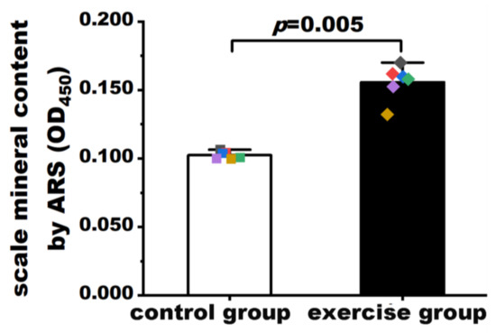 The results of the quantification of mineralization in zebrafish scales are shown in Figure 2. The explanted scales of six fish from each group were incubated with ARS. The dye was then extracted by treatment with EDTA and read at 450 nm with a microplate reader. As shown in Figure 2, the mineralization levels in zebrafish scales were significantly higher in the exercise group (0.156 ± 0.012, n = 6) than in the control group (0.102 ± 0.003, n = 6, p = 0.005). The result of the permutation test (p = 0.001) was consistent with that of the Student’s t test.