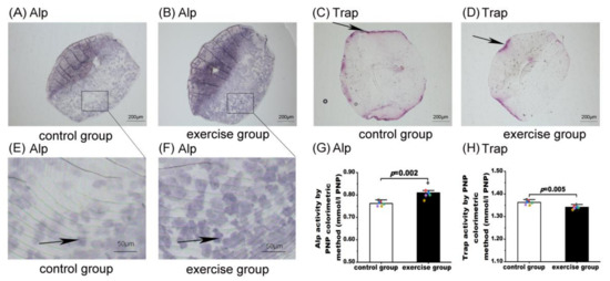Measurements of alkaline phosphatase (Alp) and anti-tartrate acid phosphatase (Trap) activities in the control and exercise groups. Results of histological staining of Alp activities (A,B) and Trap activities (C,D; black arrows indicate the resorption activity along the anterior/lateral edge); closer views of histological staining of Alp activities (E,F; black arrows indicate the ALP-positive cells); results of biochemical assay of Alp activities and Trap activities (G,H). Values are expressed as mean and standard deviation. Student’s t test was used to compare the differences in biochemical activities of Alp and Trap between the exercise group and the control group. The black, red, blue, green, purple, and yellow squares represent control group fish number 13, 14, 15, 16, 17, and 18, respectively. The black, red, blue, green, purple, and yellow diamonds represent exercise group fish numbers 14, 15, 16, 17, 18, and 19, respectively.