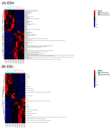 A total of 75 DMs in the ESI+ mode and 28 DMs in the ESI− mode (Table S4) were determined with VIP values ≥ 1, FC ≥ 1.20 or ≤0.83, and p-values < 0.05. In the ESI+ mode, 41 metabolites were upregulated, i.e., N-acetyl valine, and 34 were downregulated, i.e., D-aspartate and pantothenic acid, in the exercise group. In the ESI− mode, 14 metabolites were upregulated, i.e., 9,10-dichlorostearic acid, and 14 were downregulated, i.e., uracil and uridine, in the exercise group. Detailed information on DMs is presented in Table S4. A heat map (Figure 4) was constructed to visualize the changes in the abundance of DMs between the exercise and control groups.
