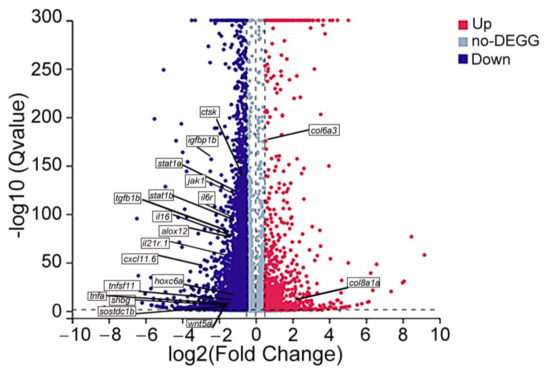 A total of 9335 DEGs were identified between the exercise and control groups (Figure 6). The statistical significance was defined as q < 0.05 (BH) and |Log2FC| > 0.5. Detailed information on the identified 9335 DEGs is shown in Table S7. Compared with the control group, 1088 genes were significantly upregulated and 8247 genes were significantly downregulated in the exercise group. Some previously reported bone-related genes were also observed the significantly differential expressions between the two groups. Col6a3 (Log2FC = 0.54, q = 2.99 × 10−176) and col8a1a (Log2FC = 2.09, q = 9.43 × 10−5) were upregulated, and igfbp1b (Log2FC = −2.42, q = 2.64 × 10−157), ctsk (Log2FC = −0.65, q = 2.55 × 10−134), il6r (Log2FC = −0.82, q = 6.75 × 10−98), tnfsf11 (Log2FC = −1.14, q = 4.02 × 10−7), sostdc1b (Log2FC = −1.77, q = 6.18 × 10−4), etc., were downregulated in the exercise group. Detailed information on these reported bone-related DEGs is shown in Table S8.