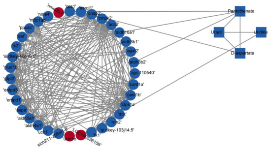 Correlation-based networks of metabolites and genes in the four identified pathways. Rectangles represent metabolites, and circles represent genes. Red indicates upregulation, and blue indicates downregulation.