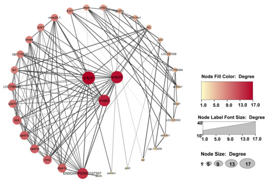 Protein–protein interaction network analysis of 35 differentially expressed genes in the four identified pathways. Entpd3, entpd1, and cmpk2 located in the center of the network are core genes.