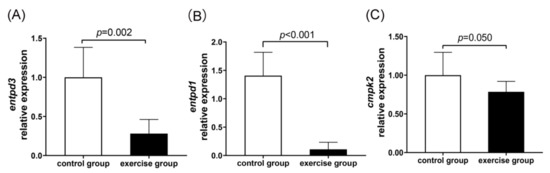 The results of mRNA expression by qRT-PCR for entpd3 (A), entpd1 (B), and cmpk2 (C, the core genes) in the control and exercise groups. All values are presented as mean and standard deviation. Student’s t test was used to compare the differences between the two groups.