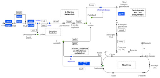 Metabolic maps of alanine, aspartate, and glutamate metabolism, pantothenate and CoA biosynthesis; pyrimidine metabolism; and β-alanine metabolism. Dots represent the metabolites. Boxes represent the genes. Blue indicates downregulation.