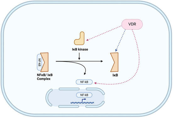 Impact of vitamin D/VDR signaling on modulating the NFκB pathway. Experimentally verified inhibitory pathways are indicated with red dashed arrows, while an ambiguous pathway is indicated with a blue dashed arrow. The NFκB effector pathway is impacted by VDR at multiple levels, including post-transcriptional mechanisms. Figure was created with BioRender.com (accessed on 4 March 2023).