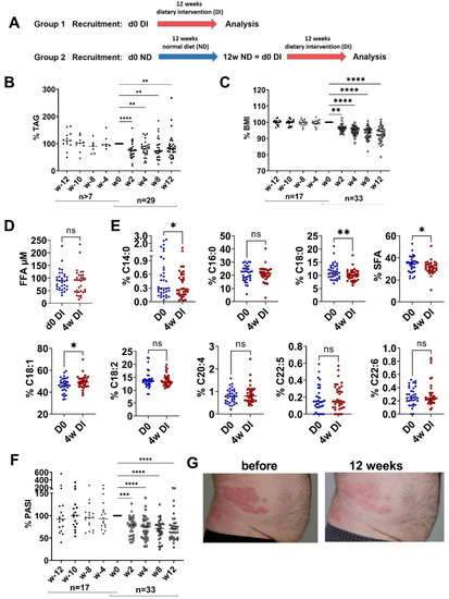 Dietary intervention reduces TAG, BMI and PASI. (A) Patients with mild-to-moderate psoriasis were randomized into two groups: group 1 with dietary intervention (DI) for 12 weeks (w); group 2 with normal diet (ND) for 12 weeks followed by a change to DI for 12 weeks. (B,C) Percent reduction in serum triglycerides (TAG) and body mass index (BMI) before and after dietary intervention compared to w0 at indicated time points. Number of patients is indicated. (D) Total serum free fatty acid (FFA) before (d0 DI) and 4 weeks of DI (4w DI). (E) Percentage of specific FFA before and 4 weeks after DI. SFA is the sum of C14:0, C16:0 and C18:0. (F) Percent reduction in Psoriasis Area and Severity Index (PASI) before and after DI compared to w0 at indicated time point. Number of patients is indicated. (G) Representative image of skin from patients before and 12 weeks after DI. (B,C,F) ANOVA with multiple comparisons and non-parametric data were used (Friedman test); ** p < 0.01, *** p < 0.001, **** p < 0.0001, compared to w0. (D,E) Paired t-test. * p < 0.05, ** p < 0.01, ns—not significant.