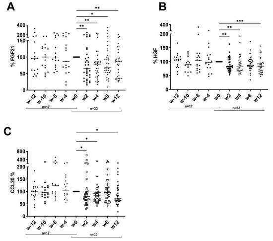 Dietary intervention reduces CCL20, FGF21 and HGF. Percent reduction in FGF21 (A), HGF (B) and CCL20 (C) before and after dietary intervention compared to w0 at indicated time point. Number of patients is indicated. ANOVA with multiple comparisons and non-parametric data were used (Friedman test). * p < 0.05, ** p < 0.01, *** p < 0.001 compared to w0.