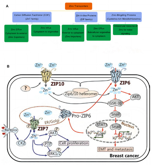 (A) Classification of zinc transporters and their functions. Abbreviations: ZIP, Zrt-Irt-like protein; ZnT, zinc transporter. (B) Zinc signaling pathways in breast cancer. The transporter-mediated imbalance of intracellular zinc can contribute to the development and progression of breast cancer. Reproduced with permission [26]. Copyright © 2022 Wiley Periodicals LLC. Reproduced with permission [10]. Copyright © 2020, Cancer Biology & Medicine.