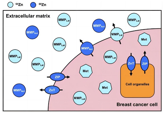 The distribution of Zn stable isotopes and their trafficking in and around a simplified breast cancer cell. Zinc in dark and light blue represents a relative enrichment in the heavy (66Zn) and light (64Zn) Zn isotope, respectively. ZIPs transport Zn into the cytoplasm both from outside the cell and from organelles. ZnTs transport Zn from the cytoplasm to both cell organelles and outside of the cell. Metallothionein and MMPs (both activated and latent) are strongly expressed compared to those in healthy breast tissue and benign tumors. Abbreviations: latent matrix metalloproteinase, MMPLat (light blue circles); activated matrix metalloproteinase, MMPAct (dark blue circles); metallothionein, Met (light blue heptagons). Reproduced with permission [24]. Copyright © Oxford University Press 2021.