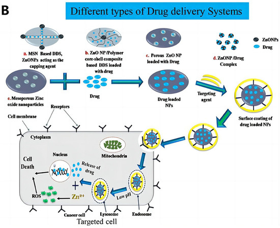 (A) Possible anticancer mechanisms of ZnONPs: Following internalization into cancer cells, ZnONPs produce Zn2+ ions via dissolution under acidic intracellular environments and cause oxidative stress. The increased ROS cause mitochondrial dysfunction and activate the intrinsic apoptosis pathway. ROS can also cause cell death via extrinsic apoptosis and necrosis pathways. ROS further induce oxidative DNA damage and mitotic death. ROS can also trigger autophagic or mitophagic cell death. (B) ZnONPs as anticancer drug delivery carriers; mesoporous silica nanoparticle-based DDS, where acid-sensitive ZnONPs are used as pore-blocking agents after drug loading inside channel-like pores; ZnO/polymer core–shell nanocomposite, where drugs are loaded within the hydrophobic shell; porous ZnONPs, where drugs are loaded inside the pores; ZnONP/drug complex via stable coordination bonding between the Zn2+ ions of ZnONPs and the oxygen-containing functional groups of the drug; porous ZnONPs loaded with drug enter the cells via endocytosis and release the drug into the cytosol after passing through the lysosome. ZnONPs also impart a synergistic anticancer effect due to the production of highly toxic Zn2+ ions in weakly acidic intracellular microenvironments. Abbreviations: DDS, drug delivery system; ROS, reactive oxygen species. Reproduced with permission [103]. Copyright © 2020 Elsevier B.V.