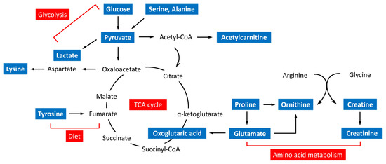 | Arginine and proline metabolism | 38 | 5 | Creatine, Proline, Pyruvate Glutamic acid, Ornithine | 1.700 × 10−5 | 0.001 | Amino acid metabolism |