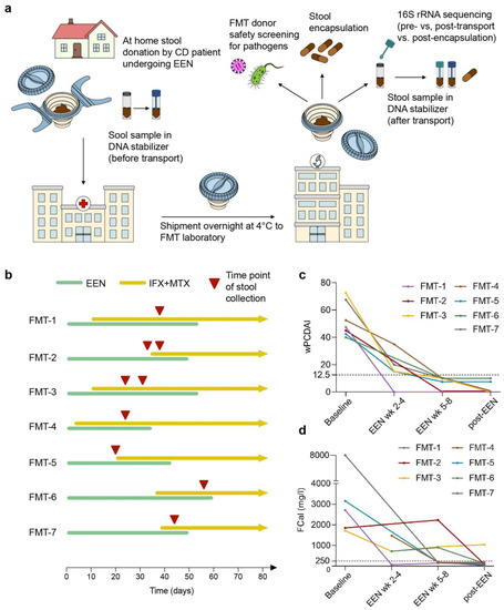Hoelz, H.; Heetmeyer, J.; Tsakmaklis, A.; Hiergeist, A.; Siebert, K.; De Zen, F.; Häcker, D.; Metwaly, A.; Neuhaus, K.; Gessner, A.; et al. Is Autologous Fecal Microbiota Transfer after Exclusive Enteral Nutrition in Pediatric Crohn’s Disease Patients Rational and Feasible? Data from a Feasibility Test. Nutrients 2023, 15, 1742. https://doi.org/10.3390/nu15071742