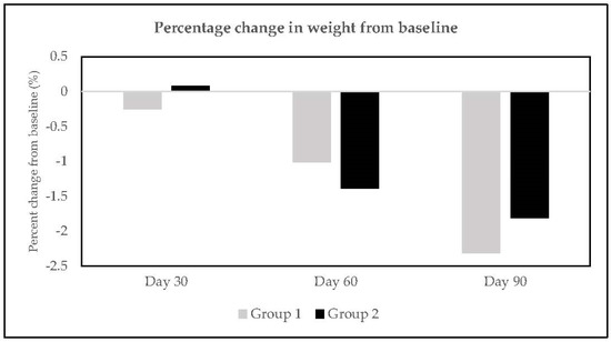 In Group 2, a statistically significant decrease was observed in body weight from baseline at Day 60 (p < 0.05) and Day 90 (p < 0.001), whereas no significant difference was observed from baseline at Day 30 (Table 2).