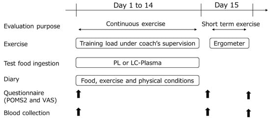 The schematic representation of the study is shown in Figure 1. The participants performed daily continuous exercise from day 1 to 14, followed by the short-term 2 h exercise on day 15. The test foods were ingested for 14 days. The participants recorded diaries during the continuous exercise period. Hematological and physiological indices were measured, and the questionnaire was conducted on days 1 and 15 (before and after exercise). The period from day 1 to 15 before exercise was set to evaluate the effects on continuous exercise, and day 15 was set to evaluate the effects of short-term exercise.
