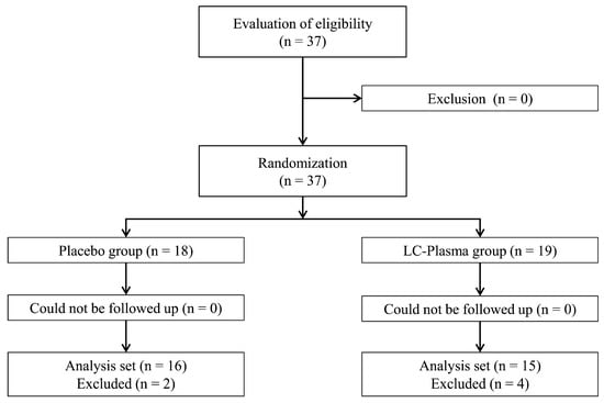 The minimum sample size was estimated on the basis of CD86 expression, which is one of the activation markers of pDCs. Our previous study reported that the standard deviation for CD86 was 20%, and the difference between the pre- and post- ingestion mean value was 15% [17]. According to these parameters, we calculated that a sample size of 16 in each arm would be required to achieve at least 80% power (β ≥ 0.8) with statistical significance (α ≤ 0.05) in a paired t-test. On the assumption that a few participants might withdraw from the study after enrollment, we determined a target number of 20 participants per group (40 in total) to detect the effect on pDC activity. The exclusion criteria were as follows: individuals with serious illnesses (diabetes, kidney/liver disease, heart disease, thyroid disease, adrenal disease, or other metabolic diseases undergoing treatment); individuals who routinely took medications for chronic diseases, individuals who were unable to stop the intake of food containing lactic acid bacteria, bifidobacteria, oligosaccharides, and live bacteria during the study period; and individuals who were considered unsuitable for the study for other reasons by the investigator or the research sponsor. There were 37 male volunteer applicants and no female applicants. We held an explanation meeting for them and obtained informed consent from all the participants. Based on the preliminary test results, 37 men were determined to be eligible. To avoid bias related to age, body height, weight, body mass index (BMI), and pDC activity at the time of the preliminary test, the person responsible for statistical analysis assigned the participants into two groups by computerized randomization using the stratified permuted block randomization method. The participants were assigned to the control food intake group (PL group, n = 19) or the investigational food intake group (LC-Plasma group, n = 18). The allocation table was sealed by the controller and securely stored until the cases were fixed and analytical results were summarized.