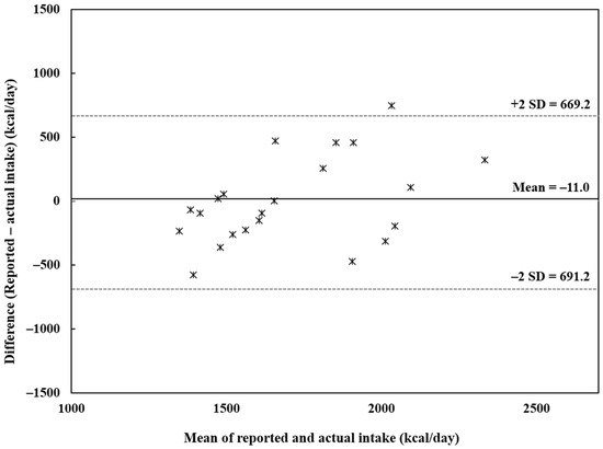 Bland–Altman plot for the reported and actual energy intake among older Korean women (n = 22) Symbols represent each individual. SD: standard deviation.