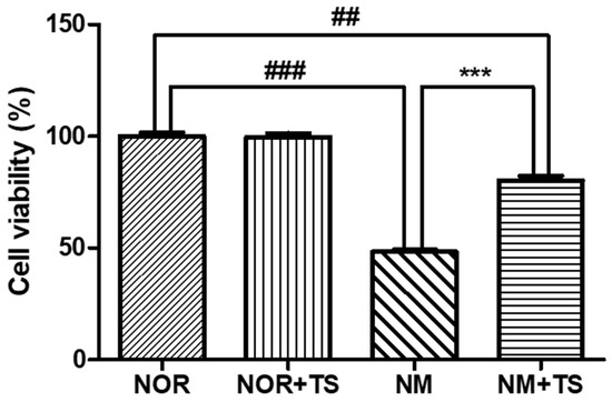 Comparison of cell viability in neomycin-treated HEI-OC1 cells with and without TS treatment. Data are presented as means ± SEM of three independent experiments conducted in triplicates. ## p < 0.01 (NOR vs. NM + TS). ### p < 0.001 (NOR vs. NM). *** p < 0.001 (NM vs. NM + TS).
