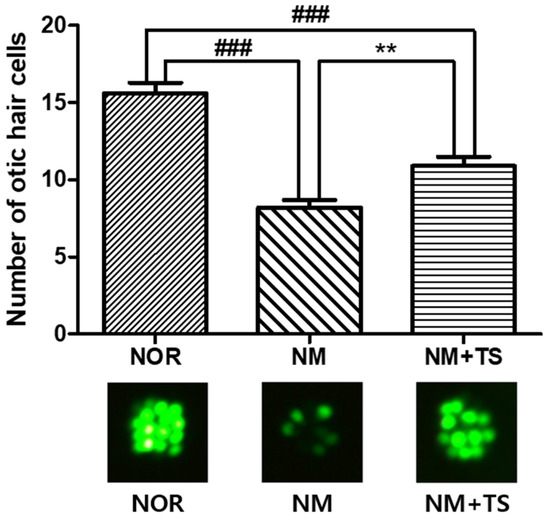 Comparison of Otic hair cells in neomycin-treated zebrafish with and without TS treatment. Data are presented as means ± SEM. ### p < 0.001 (NOR vs. NM and NOR vs. NM + TS). ** p < 0.01 (NM vs. NM + TS). N = 10 per group.