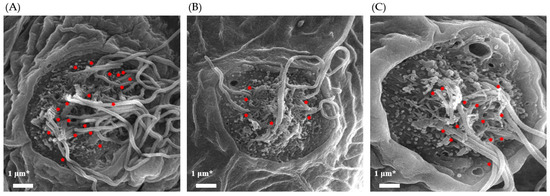 SEM images of neuromasts in zebrafish larvae: (A) normal group (NOR); (B) neomycin-treated group (NM) (C) TS-treated group (NM + TS). Identifiable kinocilia are indicated with red arrows. * Scale bar = 1 μm.