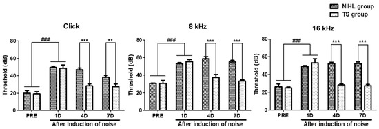 Comparison of hearing thresholds in noise-induced hearing loss mice with and without TS treatment. Hearing thresholds of noise-induced hearing loss (NIHL) and TS groups (TS) were measured using clicks and 8 and 16 kHz tone bursts prior to (PRE) and 1, 4, and 7 days (1D, 4D, and 7D) after noise exposure. Data are presented as means ± SEM. Data were analyzed using two-way ANOVA followed by Bonferroni post hoc test. ### p < 0.001 (PRE vs. 1D). ** p < 0.01 and *** p < 0.001 (NIHL vs. TS). N = 10 per group.