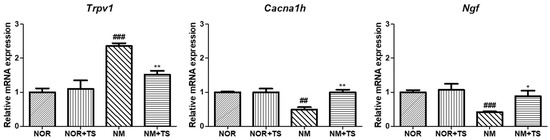 Comparison of gene expression of Trpv1, Ngf, and Cacna1h in neomycin-treated HEI-OC1 Cells. Data are presented as means ± SEM of three independent experiments run in triplicate. ## p < 0.01, ### p < 0.001 (NOR vs. NM). * p < 0.05 ** p < 0.01 (NM vs. NM + TS).